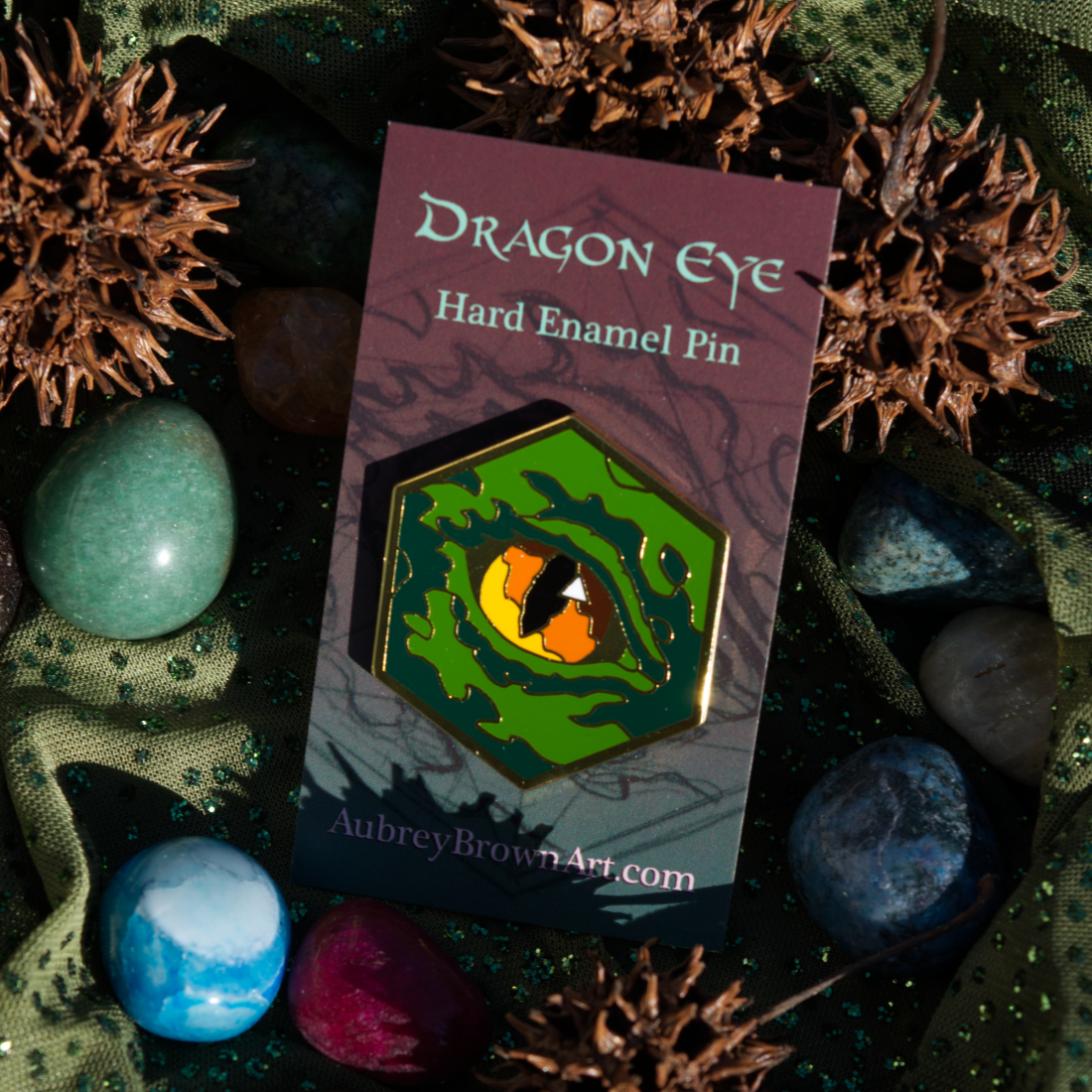 A gorgeous hard enamel dragon eye pin. Green with orange eye. Polished brass finish, with two black rubber backing clutches.