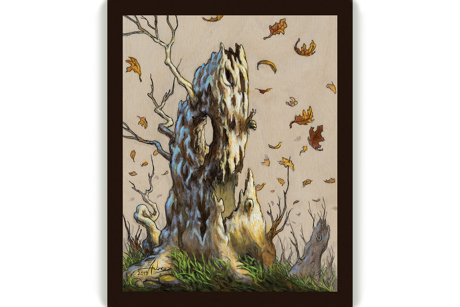 A magical tree stump stands on a grassy hill as oak leaves blow through the air.